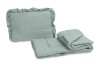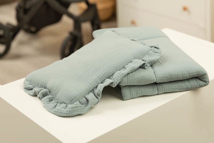 Súprava obsahuje vankúš a deku vyrobené z príjemného mušelínu na dotyk. Súprava je ideálna do kočíka, postieľky alebo ako mäkká podložka pre bábätko. Samotný vankúš môže slúžiť ako maznáčik. Súprava je vyrobená z dvoch materiálov – vnútorná strana je 100% bavlna, vonkajšia vrstva je mäkký mušelín.