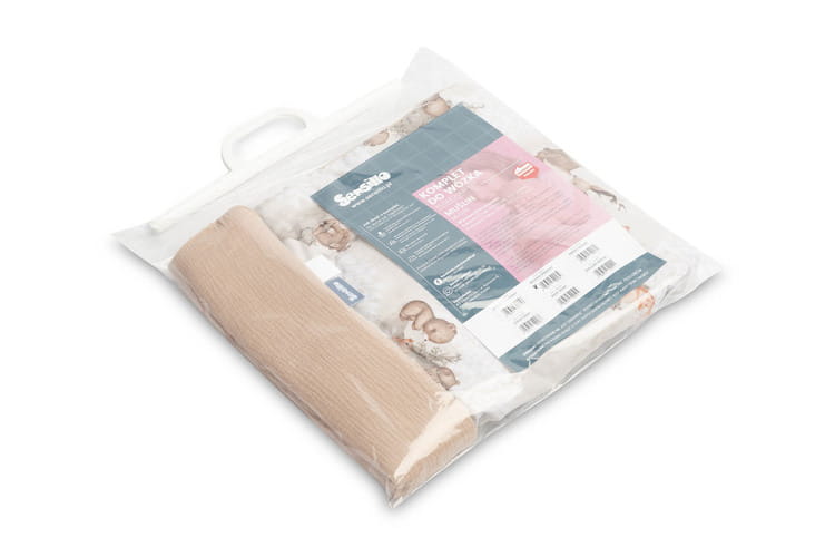 Súprava obsahuje vankúš a prikrývku vyrobené z príjemného mušelínu a bavlny. Súprava je ideálna do kočíka, postieľky alebo ako mäkká podložka pre bábätko. Samotný vankúš môže slúžiť ako plyšová hračka. Súprava je vyrobená z dvoch materiálov – vnútorná strana je zo 100% bavlny, vonkajšia vrstva je mäkký mušelín.