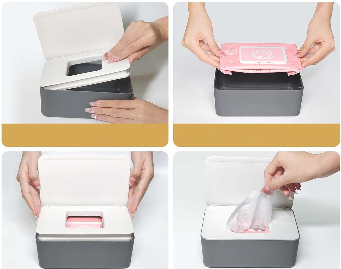 - Uzamykateľné veko a silikónové tesnenie zabezpečujú, že obrúsky nevysychajú.