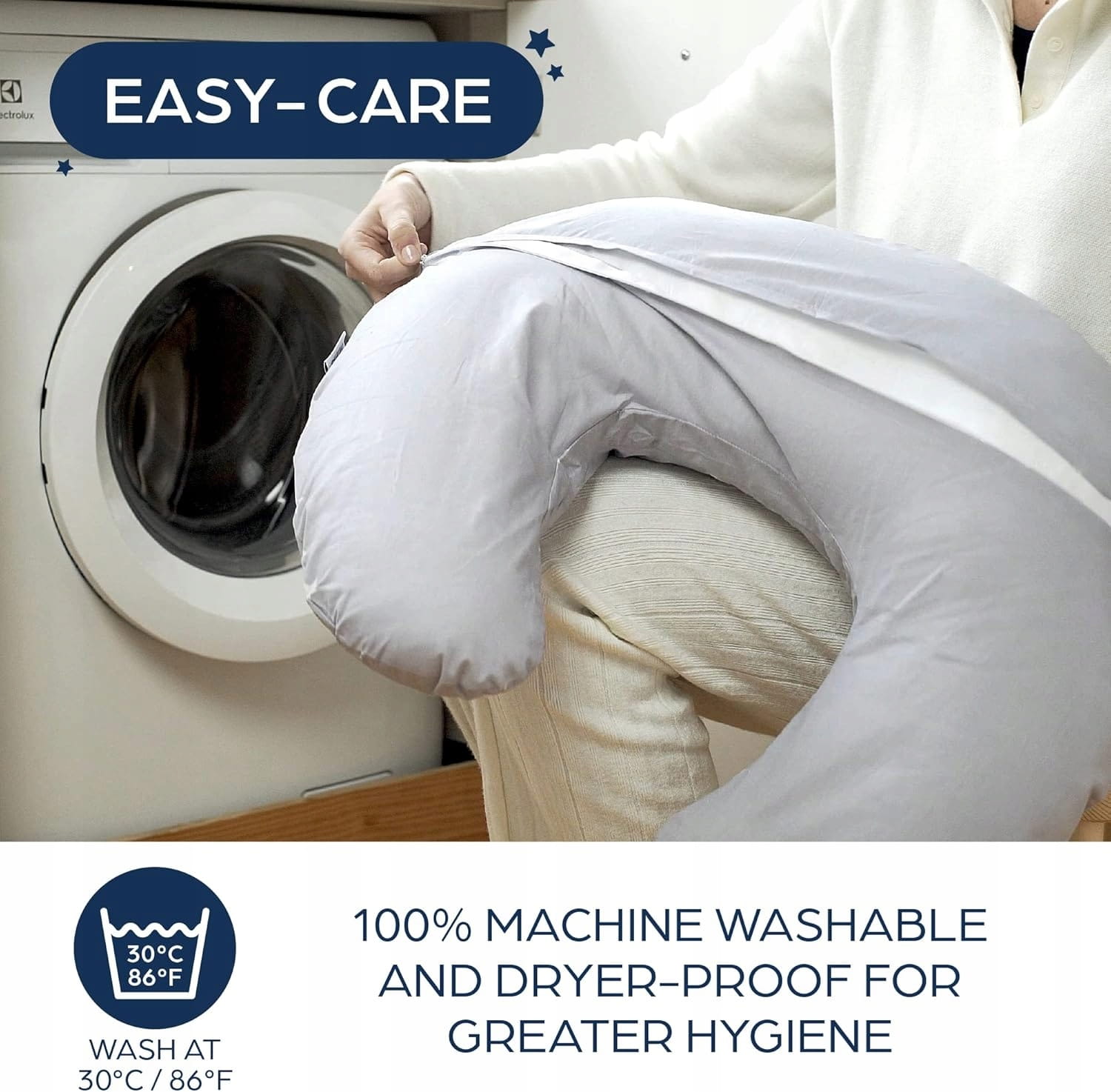 - Jednoduchá údržba: Tento tehotenský vankúš je možné prať v práčke a sušiť v sušičke, čo zaručuje vyššiu hygienu. Mäkký bavlnený poťah a odolná polyesterová výplň si určite zachovajú svoj tvar a mäkkosť aj pri častom používaní.
