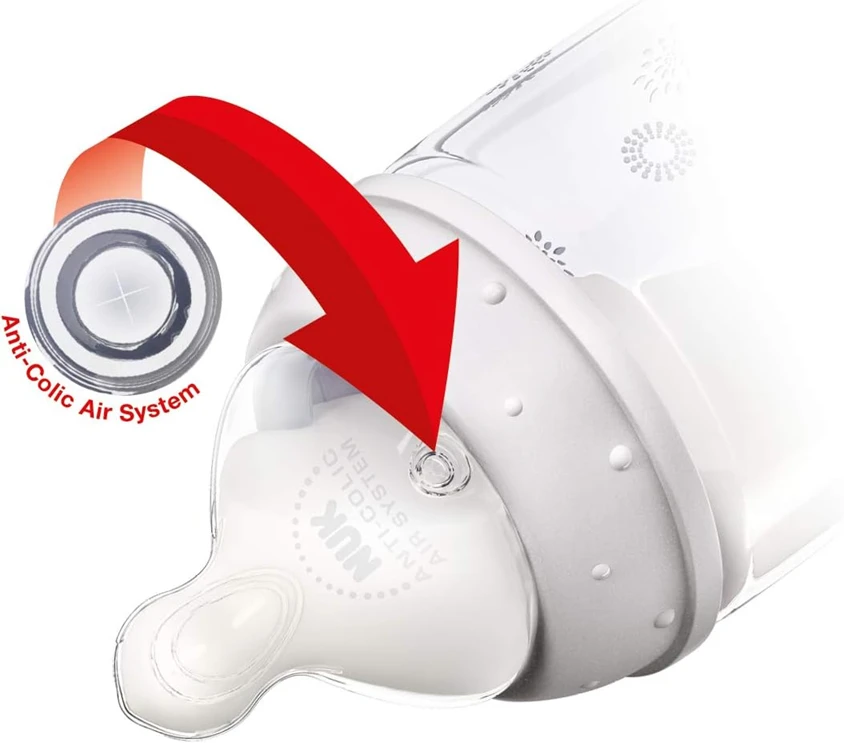 - Antikolikový systém NUK Air System - integrovaný ventil umožňuje pitie bez prerušenia.