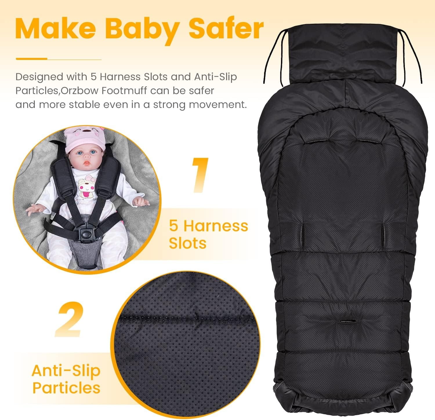 - Spoľahlivá bezpečnosť a protišmykový dizajn: Vybavený reflexnými pásikmi a 6 otvormi na popruhy, Orzbow Baby Footmuff vhodný pre väčšinu kočíkov poskytuje vám a vášmu dieťaťu dostatočnú bezpečnosť aj v tme. Okrem toho univerzálny fusak do kočíka Orzbow má silnú ochranu proti prevráteniu a protišmykový systém, ktorý vám pomôže starať sa o dieťa: â‘ Protišmykové častice na zadnej strane ②Pokrývka horného panelu v hornej časti ③Pásky na hornom paneli na uchytenie ku kočíku