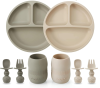 Kompletná súprava na učenie samostatného jedenia a pitia. Mäkký silikón potravinárskej kvality je jemný k ďasnám, ľahký a odolný voči pádom, a taniere so silnou prísavkou zostávajú na mieste, čím obmedzujú neporiadok. Ideálne pre BLW a každodenné jedlá doma aj na cestách.