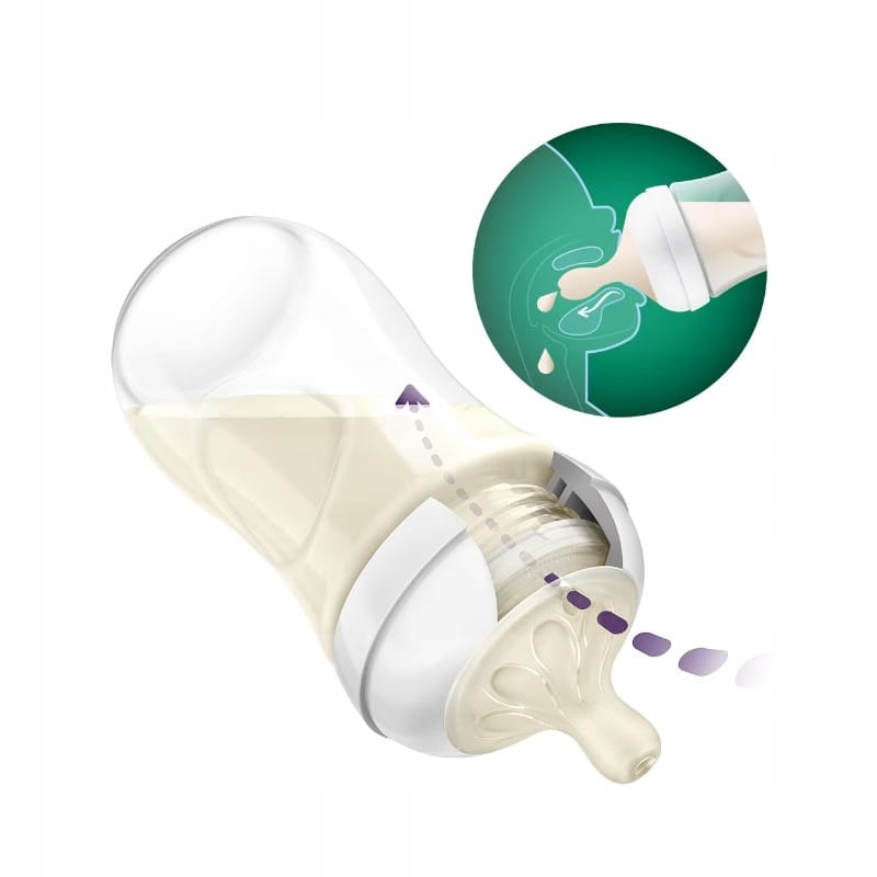 - Antikolikový ventil: fľaša je navrhnutá tak, aby udržiavala vzduch mimo bruška dieťaťa počas pitia