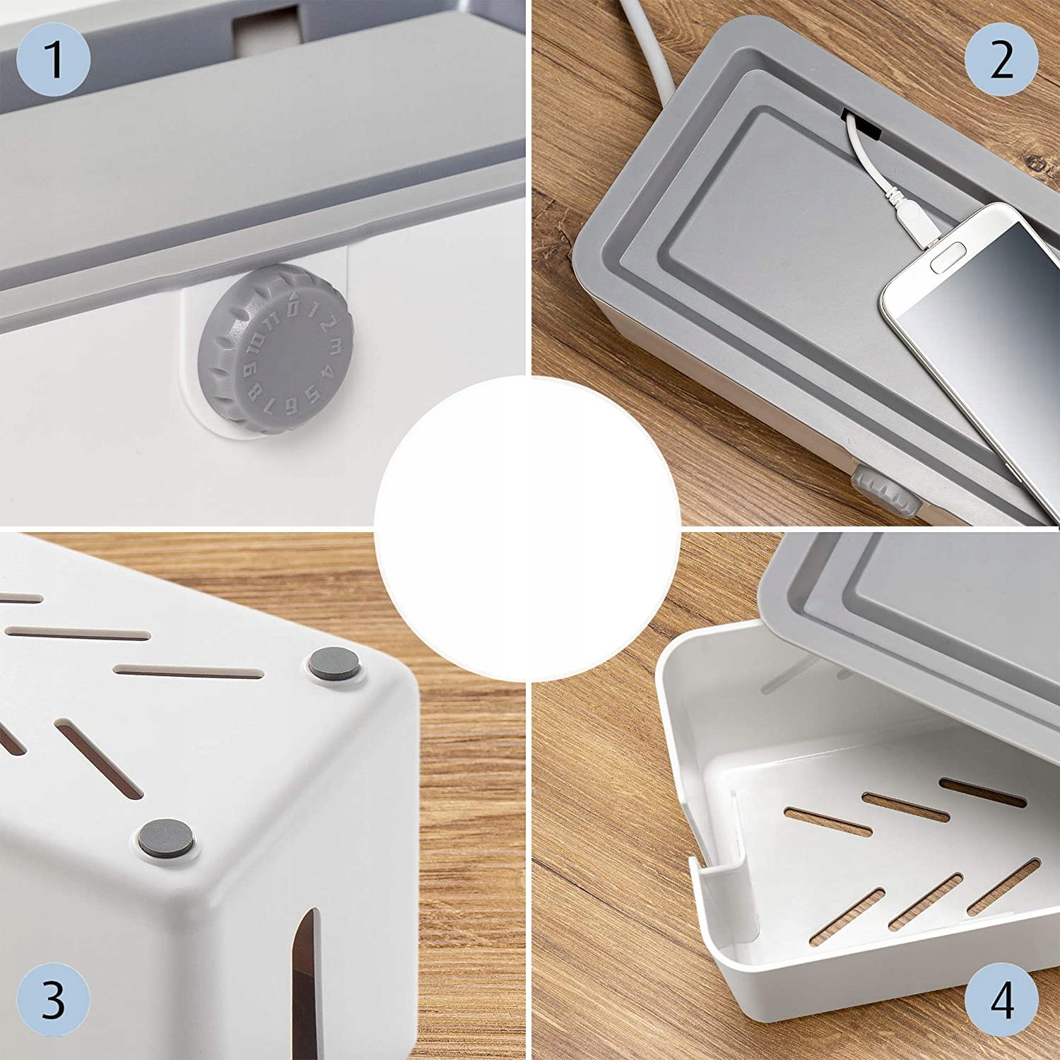 - Gumové nožičky na spodnej strane zabraňujú šmýkaniu boxu a poškriabaniu povrchu, na ktorom stojí.