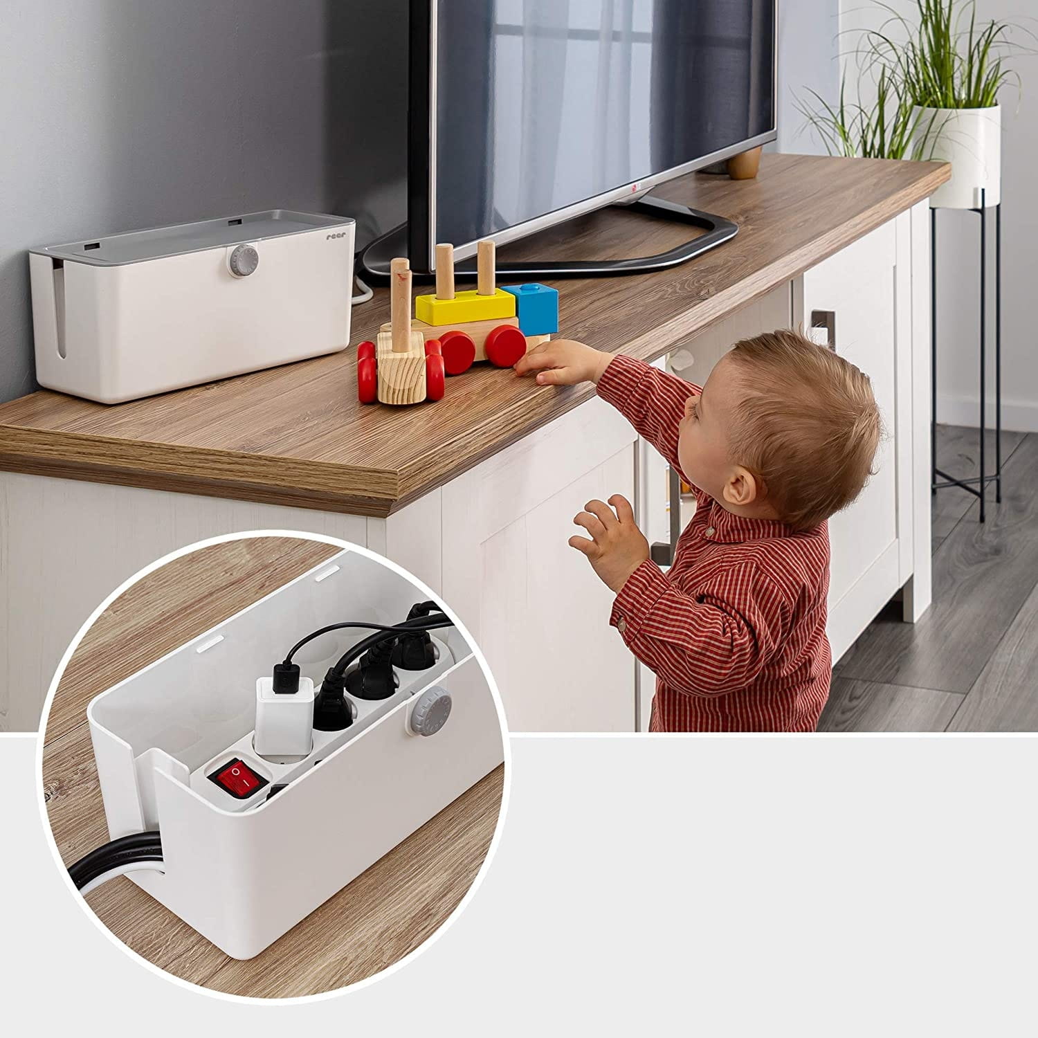 - Zabraňuje dieťaťu prístup k elektrickým lištám a zástrčkám káblov.