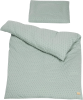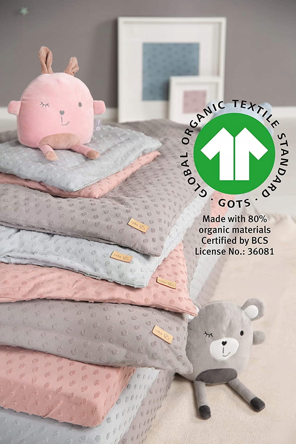 - Súprava posteľnej bielizne obsahuje obliečku na vankúš 40 x 60 cm a obliečku na prikrývku 100 x 135 cm, džersej s terry Dots, 80% organickej bavlny, 20% polyesteru. Možno prať pri teplote 40°C. Farba: strieborno-sivá
