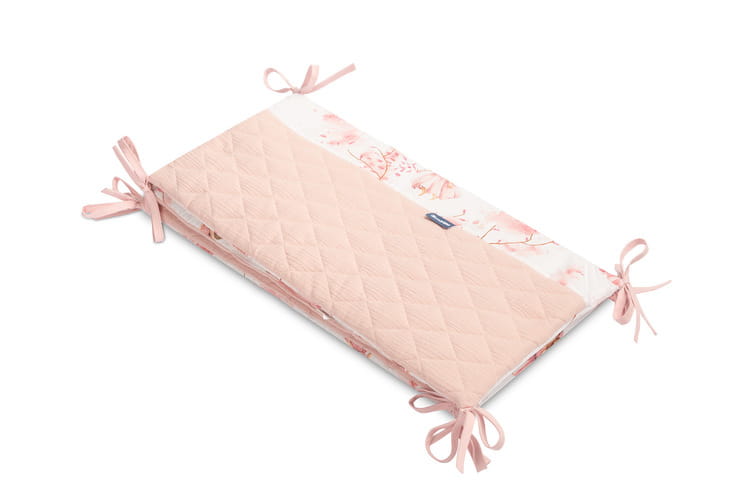 Chránič do postieľky pasuje do každej štandardnej detskej postieľky. Chránič je vyrobený z mäkkej bavlny s potlačou a príjemného na dotyk mušelínu. Polyesterová výplň ochráni dieťa pred zraneniami počas pohybu v postieľke. Udržiavanie chrániča v správnej polohe zabezpečujú stužky na priviazanie k priečkam postieľky. Navrhnutý je pre postieľku s rozmermi 120x60 cm. Chránič bude skvelým doplnkom do výbavičky pre bábätko.