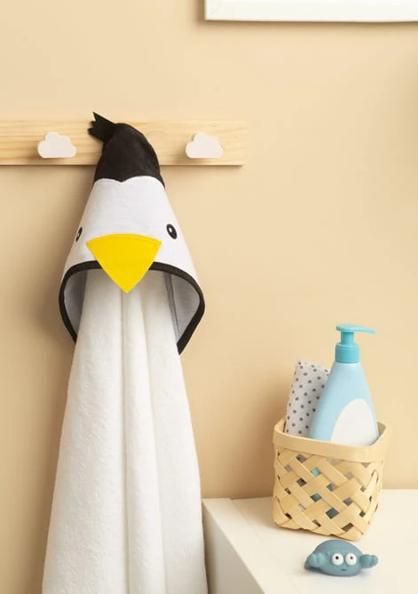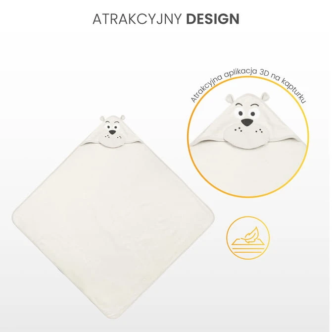 Kapucňa chráni hlavičku dieťaťa pred chladom a uľahčuje rýchle vysušenie vlasov. Aplikácia v tvare roztomilých zvieratiek upúta pozornosť dieťaťa a kúpanie sa stáva príjemnou súčasťou každého dňa.