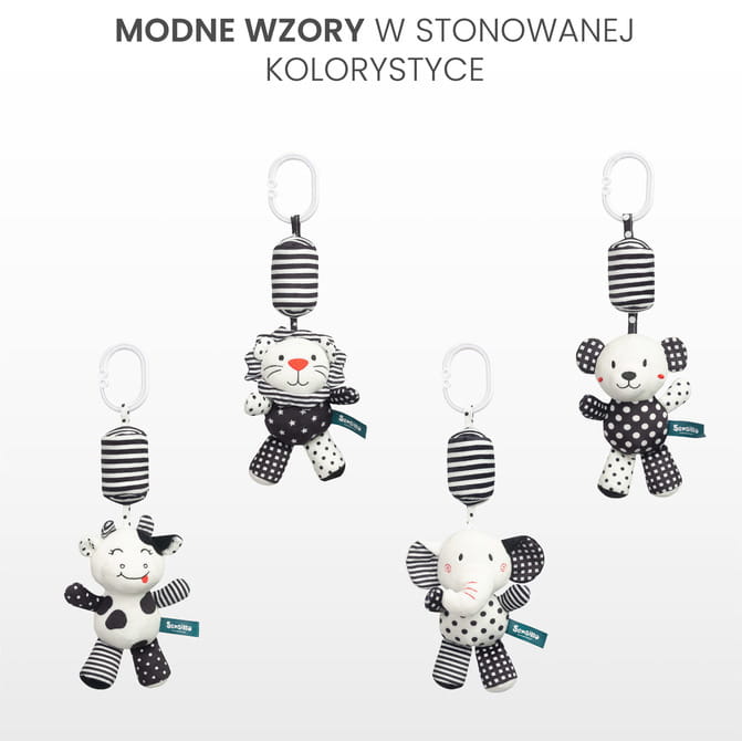 Závesná hračka na kočík pre bábätká, vynikajúca kontrastnými farbami čiernej a bielej, bola navrhnutá s ohľadom na vizuálnu stimuláciu a senzorický rozvoj dieťaťa. Jej jednoduchý, ale mimoriadne funkčný dizajn priťahuje pozornosť dieťaťa a rôznorodé textúry a tvary poskytujú pútavú zábavu.