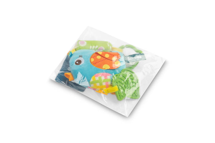 Žiarivé farby a kontrastné vzory priťahujú pozornosť bábätka, stimulujú jeho zvedavosť a pomáhajú rozvíjať zrakové vnímanie. Mäkká tkanina, hryzátko v tvare listu a hrkajúca výplň povzbudzujú k uchopovaniu, traseniu a objavovaniu nových textúr.