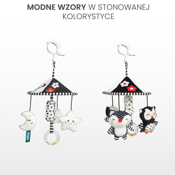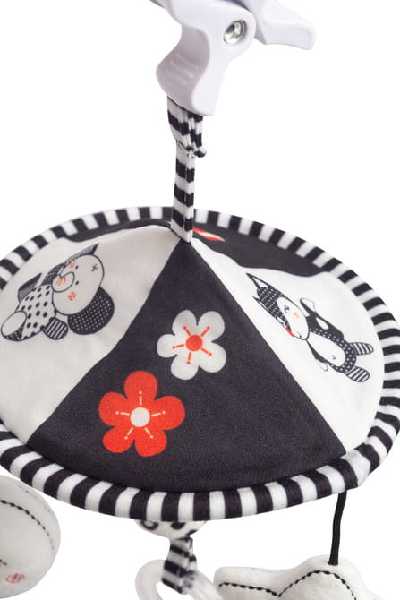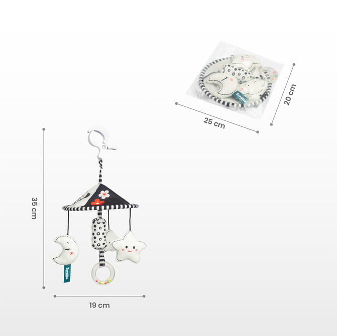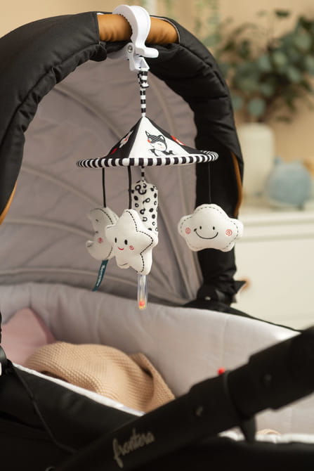Pridajte trochu radosti a zábavy na prechádzky s naším elegantným kolotočom na detský kočík. Vďaka minimalistickému čierno-bielemu farebnému prevedeniu sa dokonale hodí ku každému kočíku, prináša harmóniu a štýl.