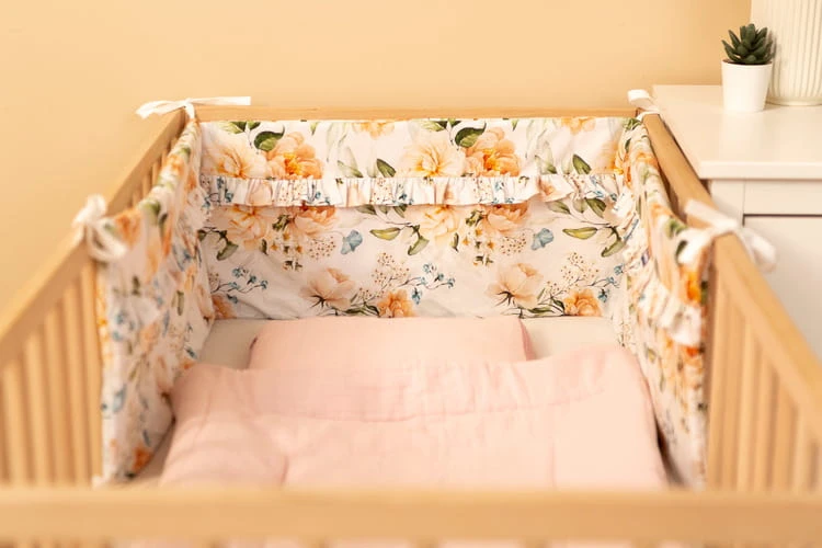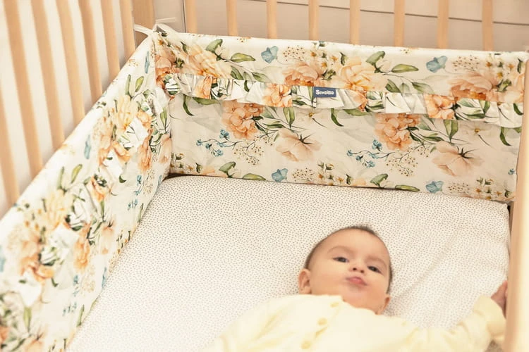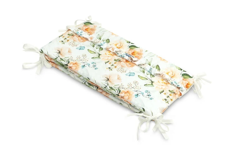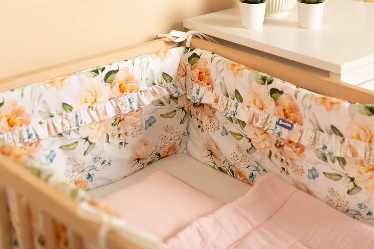Chránič do postieľky pasuje do každej štandardnej detskej postieľky. Vyniká krásnymi materiálmi a všitou volánkou, ktoré dodajú detskej izbičke výnimočný šarm. Chránič je vyrobený z mäkkej bavlny s potlačou. Výplň z vaty ochráni dieťa pred zraneniami počas pohybu v postieľke. Udržiavanie chrániča v správnej polohe zabezpečuje husté našitie stužiek na pripevnenie k priečkam postieľky. Navrhnutý je pre postieľku s rozmermi 120x60 cm. Chránič bude skvelým doplnkom do výbavičky pre bábätko.