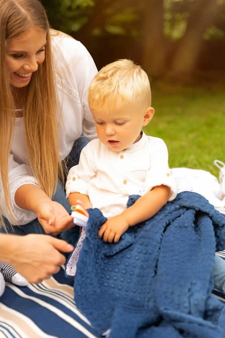 Ľahká deka Minky je vynikajúcim riešením na jarné a letné prechádzky. Vyrobená z jemnej bavlny a mäkkej tkaniny minky, podľa potreby môže byť používaná obojstranne. Každý vzor deky má iný farebný potlač. Na deke sa nachádzajú aj pestrofarebné stužky, ktoré zaujmú každé bábätko. Univerzálna ľahká deka do kočíka alebo postieľky s rozmerom 75×100 cm.