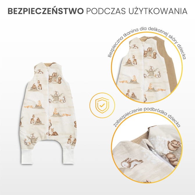 Spací vak je vyrobený z mäkkej tkaniny, ktorá je šetrná k detskej pokožke, vďaka čomu zabezpečuje optimálnu teplotu a zabraňuje prehriatiu dieťaťa počas spánku. Dodatočné lemovanie na konci zipsu pri krku chráni citlivú pokožku dieťaťa počas používania.
