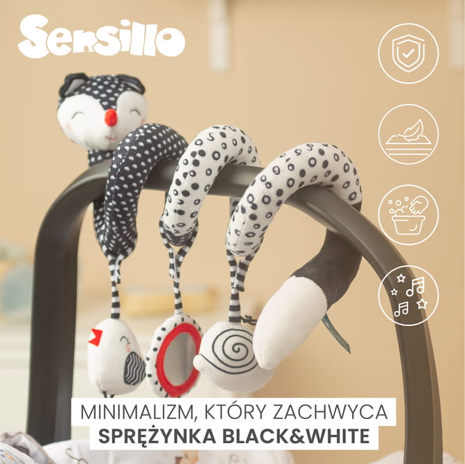 Špirála je vybavená 3 visiacimi senzorickými hračkami, ktoré zabezpečia bábätku zábavu a rozveselia ho kedykoľvek. Kontrastné farby a interaktívne závesy stimulujú rozvoj zmyslov dieťaťa.
