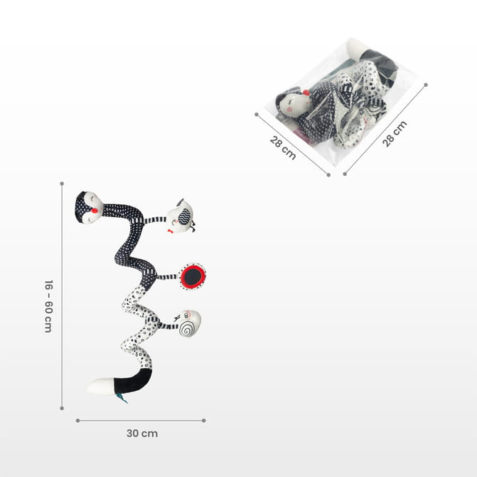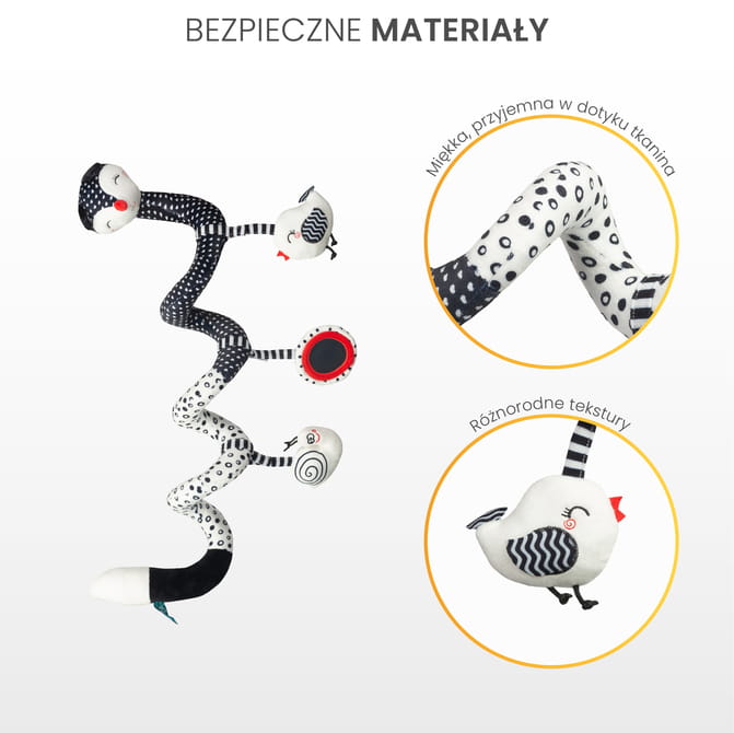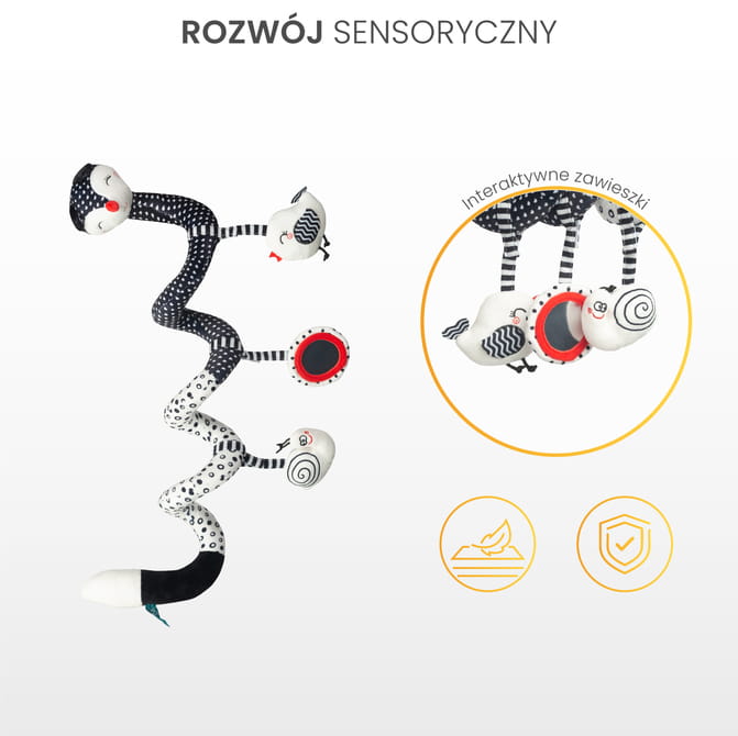 Postarajte sa o senzorický rozvoj svojho bábätka vďaka roztomilej plyšovej špirále! Je to mäkká, pružná hračka, ktorú jednoducho pripevníte na rukoväť kočíka, autosedačky alebo postieľky.