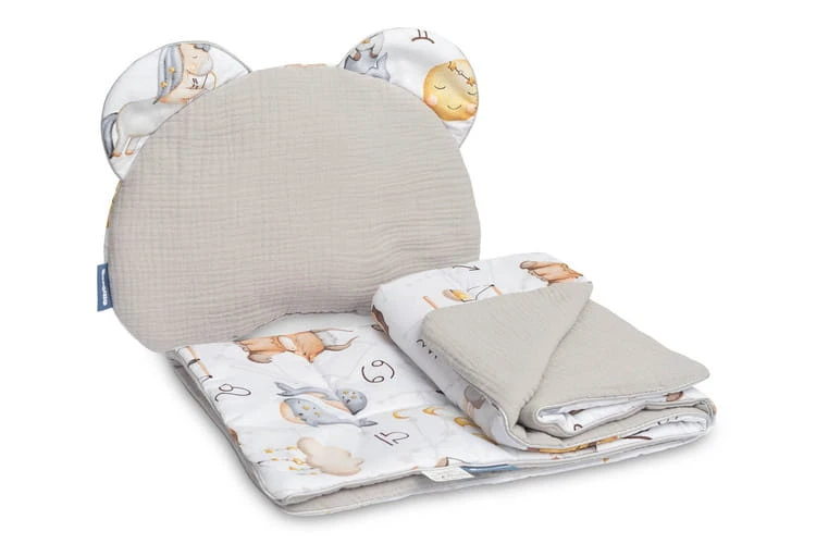 Súprava obsahuje vankúš a deku vyrobené z príjemného mušelínu a bavlny. Súprava je ideálna do kočíka, postieľky alebo ako mäkká podložka pre bábätko. Samotný vankúš môže slúžiť ako maznáčik. Súprava je vyrobená z dvoch materiálov – vnútorná strana je 100% bavlna, vonkajšia vrstva je mäkký mušelín.