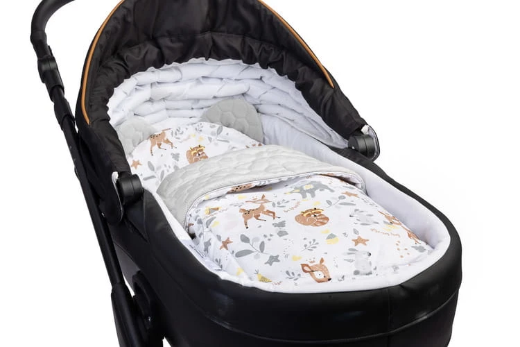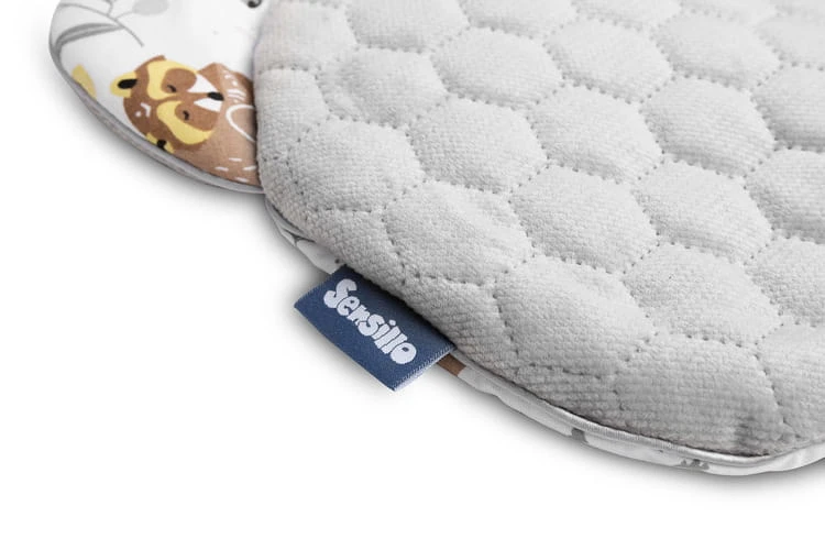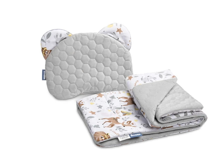 Súčasťou súpravy je roztomilý vankúšik s uškami medvedíka a paplónik s jemnou výplňou zo silikónového vlákna. Obojstranná súprava je vyrobená z vysokokvalitných materiálov – farebnej bavlny a veľmi príjemnej látky velvet, ktorá pohladí každé bábätko. Súprava je ideálna do kočíka, postieľky, kolísky alebo ako podložka pre bábätko. Samotný vankúšik môže slúžiť ako maznáčik. Vysokú kvalitu spracovania podčiarkuje estetická lemovka.
