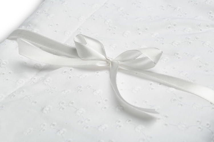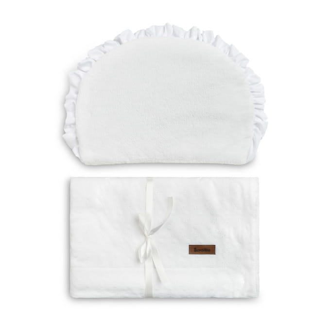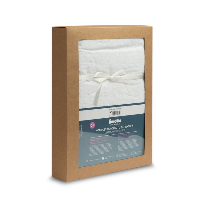 Komplet na krst do kočíka je elegantná biela súprava pozostávajúca z vankúša a ľahkej deky. Jedna strana súpravy je vyrobená z bavlny s roztomilou a jemnou anglickou výšivkou. Druhá strana je mäkký plyš, ktorý príjemne obopne bábätko. Vankúš je vyplnený ľahkým, antialergickým silikónovým vláknom, ktoré sa počas používania neposúva. Deka nemá ďalšiu výplň, je ľahká a plyšová vrstva poskytuje dostatočnú ochranu pred chladom.