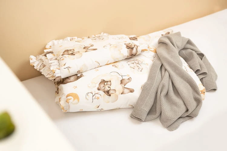 2-dielna posteľná bielizeň s volánom je ušitá z príjemnej na dotyk a odolnej bavlny. Farebné kombinácie budú ideálne pasovať do každej detskej izby. Súprava obsahuje obliečku na perinu s rozmermi 100x135cm a obliečku na vankúš 40x60cm. Obliečka na perinu je na zips, zatiaľ čo vankúš je na preklad.