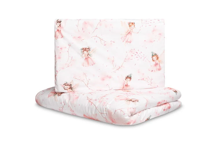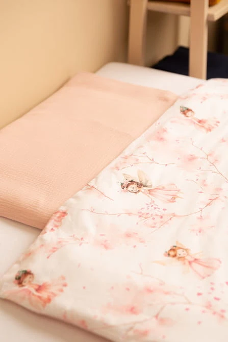 Posteľná bielizeň je ušitá z príjemného na dotyk mušelínu a 100% bavlny. Súprava obsahuje obliečku na perinu a vankúš. Celok bude tvoriť roztomilý akcent v detskej izbe. Obliečka na vankúš je uzatváraná na preklad a pasuje na výplne s rozmermi 40×60 cm. Obliečka na perinu má zapínanie na zips a pasuje na výplne s rozmermi 100×135 cm.