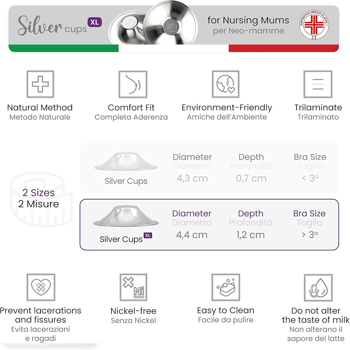 - Odolné a Jednoduché na Použitie: Ochranné krytky SilverCups sú vyrobené z trilaminovaného striebra, čo zaručuje ich trvácnosť a odolnosť. Sú opakovane použiteľné, čo z nich robí praktické riešenie pre dojčiace matky