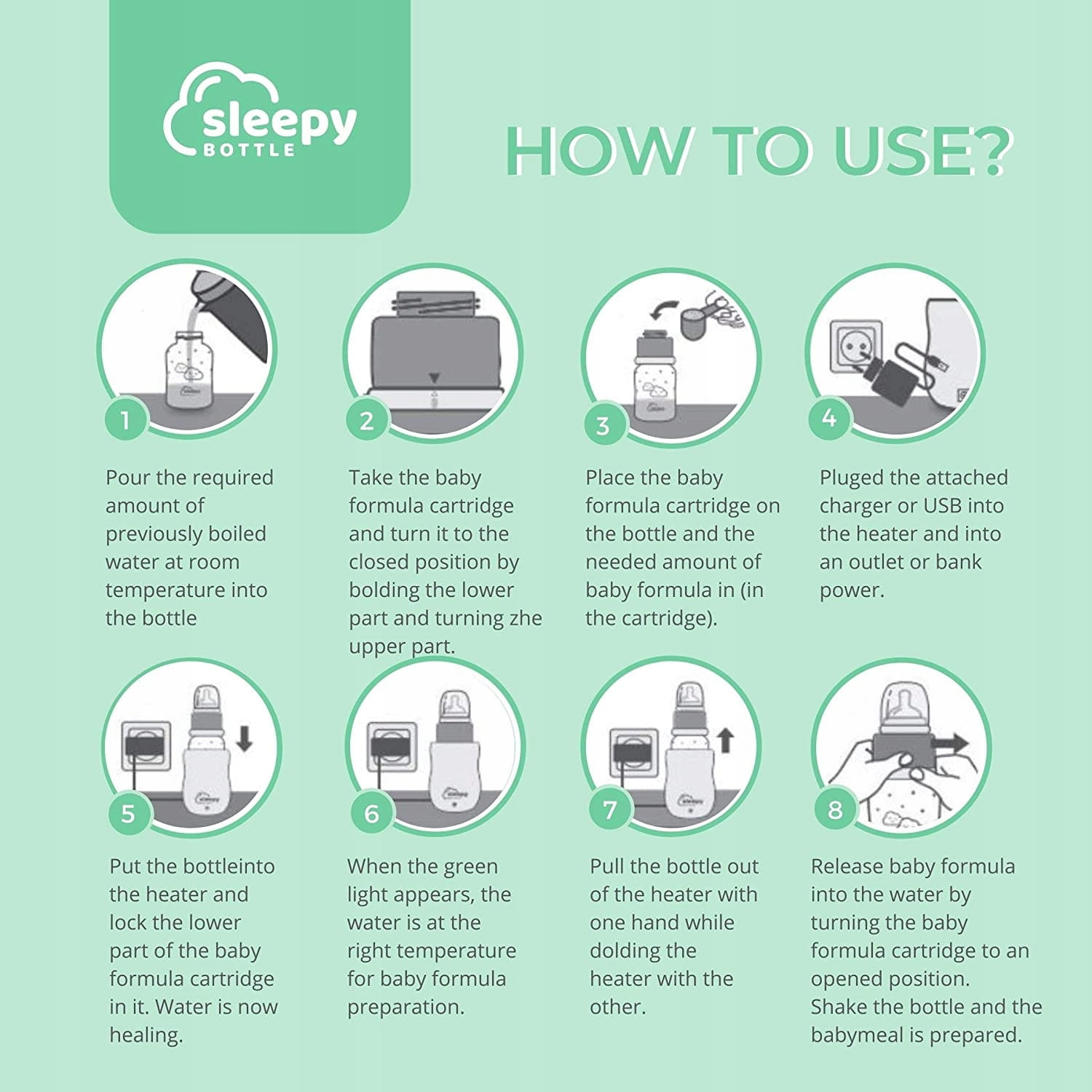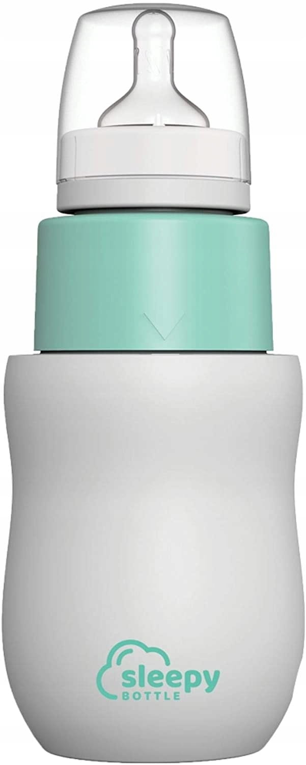 - Štartovacia sada na pravdepodobne najrýchlejšiu prípravu dojčenskej fľaše na svete. Štartovacia sada Sleepy Bottle sa skladá z dojčenskej fľaše s cumlíkom (veľkosť M pre 2-6 mesiacov) a viečka, nadstavca s integrovanou nádobou na detskú výživu a ohrievača fliaš. Ohrieva studenú vodu na 37 °C za 30 až 40 minút - presne na komfortnú teplotu na pitie pre bábätká. Po dosiahnutí tejto teploty je udržiavaná pri nízkej spotrebe energie.Čas jedlaKeď na tom záleží a dieťa v noci žiada fľašu, Sleepy Bottle je pripravený na použitie v priebehu niekoľkých sekúnd. Jednoducho odskrutkujte nadstavec a energicky pretrepte fľašu, ako pri všetkých tradičných dojčenských fľašiach - voila! Jedlo pre dieťa je pripravené.Takto to funguje: Otočenie otvorí spodnú časť nadstavca v strednej časti, vďaka čomu sa prášok môže zmiešať s vodou.Čas spánkuPred spaním je možné všetko pripraviť na pokojný spánok: nalejte vodu, doplňte detskou výživou, vložte fľašu do ohrievača, zapnite a dobrú noc. Ideálnym miestom pre fľašu pre dieťa je pravdepodobne nočný stolík v spálni rodičov.Nízke napätie 12 V.Napájanie prebieha cez adaptér 12 V v zásuvke alebo cez USB kábel do powerbanky alebo nabíjačky mobilného telefónu. Jednoducho použite 12 V autoadaptér s USB vstupom na cestách.Vždy dokonale temperovaná dojčenská fľašaIdeálny spoločník na cesty vďaka napájaniu 12VDobre premyslená konštrukcia udržiava suchosť a čerstvosť detskej výživy až do času jedlaInteligentná regulácia teploty ohrieva a udržiava teplotu na úrovni 37°CLED diódy signalizujú, kedy je voda teplá a pripravenáJednoduché ovládanie, ľahké čistenieVždy čerstvá detská výživa, bez straty živínCelá sada Sleepy Bottle má 23 cm na výšku a 9 cm na šírku. Toto zariadenie s ohrievačom fliaš váži 300 gramov, vďaka čomu je ľahké a ideálne na cestovanie.Bez ohrievacieho prvku (iba fľaša, vložka a prísavka s viečkom) má Sleepy Bottle 21 cm na výšku a 7,8 cm na šírku. Hmotnosť cca 120 gramov.