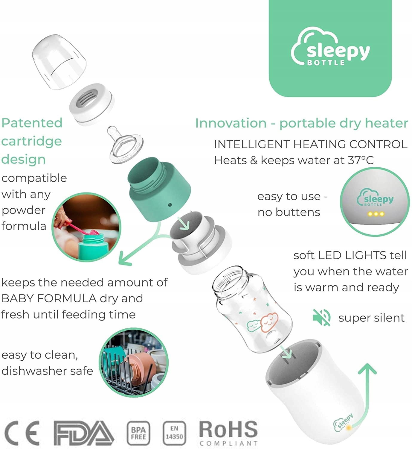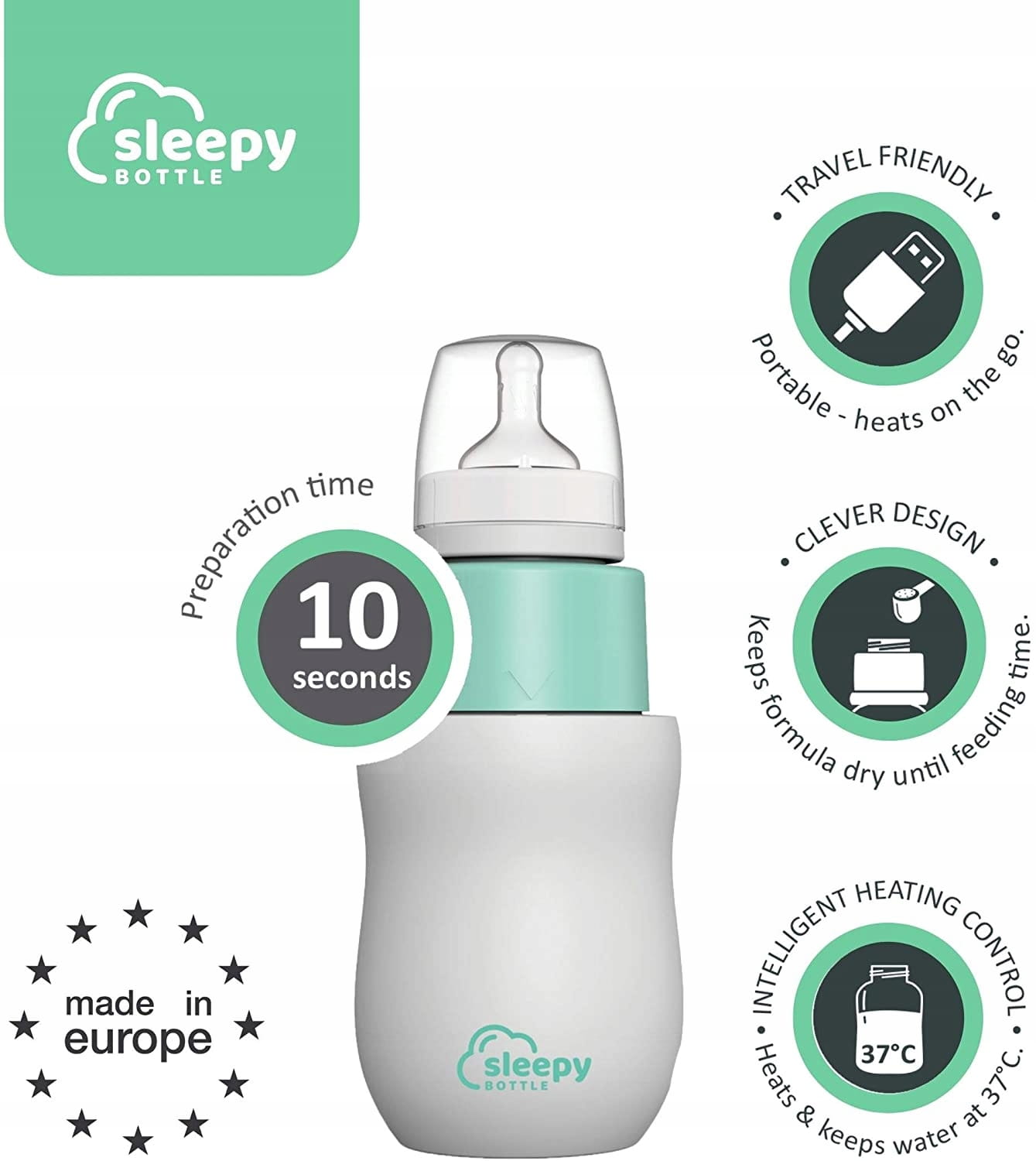 - Štartovacia sada na pravdepodobne najrýchlejšiu prípravu fľaše pre dojčatá na svete. Štartovacia sada Sleepy Bottle sa skladá z dojčenskej fľaše s cumlíkom (veľkosť M pre 2-6 mesiacov) a viečka, nástavca s integrovanou nádobou na detskú výživu a ohrievača fliaš. Ohrieva studenú vodu na 37 °C za 30 až 40 minút - presne na komfortnú teplotu na pitie pre bábätká. Po dosiahnutí tejto teploty je udržiavaná pri nízkej spotrebe energie.Čas jedlaKeď na tom záleží a dieťa v noci žiada fľašu, Sleepy Bottle je pripravený na použitie v priebehu niekoľkých sekúnd. Stačí odskrutkovať nástavec a energicky pretrepať fľašu, ako pri všetkých tradičných dojčenských fľašiach - hotovo! Jedlo pre dieťa je pripravené.Takto to funguje: Otočenie otvorí spodnú časť nástavca v strednej časti, vďaka čomu sa prášok môže zmiešať s vodou.Čas spánkuPred spaním je možné všetko pripraviť na pokojný spánok: nalejte vodu, doplňte detskou výživou, vložte fľašu do ohrievača, zapnite a dobrú noc. Ideálnym miestom na fľašu pre dieťa je pravdepodobne nočný stolík v spálni rodičov.Nízke napätie 12 V.Napájanie prebieha cez adaptér 12 V v zásuvke alebo cez USB kábel do powerbanky alebo nabíjačky mobilného telefónu. Jednoducho použite 12 V autoadaptér s USB vstupom na cestách.Vždy dokonale temperovaná dojčenská fľašaIdeálny spoločník na cesty vďaka napájaniu 12VDobre premyslená konštrukcia udržiava suchosť a čerstvosť detskej výživy až do času jedlaInteligentná regulácia teploty ohrieva a udržiava teplotu na úrovni 37°CLED diódy signalizujú, kedy je voda teplá a pripravenáJednoduché ovládanie, ľahké čistenieVždy čerstvá detská výživa bez straty živínCelá sada Sleepy Bottle má výšku 23 cm a šírku 9 cm. Toto zariadenie s ohrievačom fliaš váži 300 gramov, vďaka čomu je ľahké a ideálne na cestovanie.Bez ohrievacieho prvku (iba fľaša, vložka a prísavka s viečkom) má Sleepy Bottle výšku 21 cm a šírku 7,8 cm. Hmotnosť cca 120 gramov.