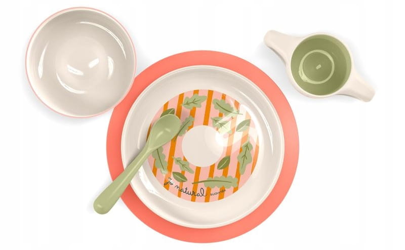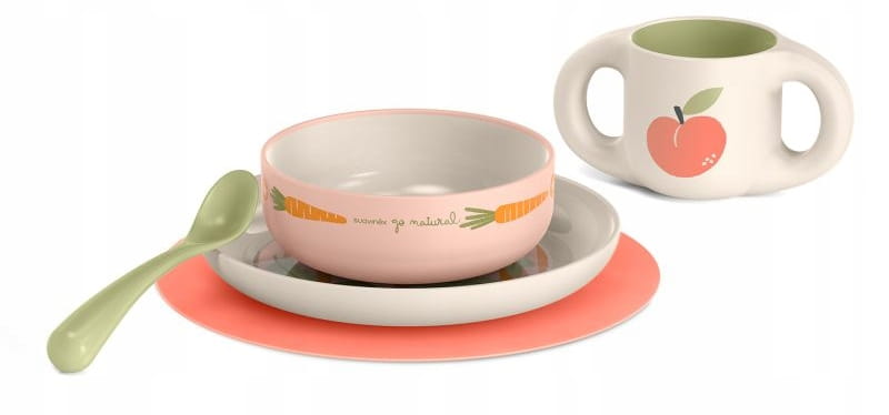 - 5-dielna súprava riadu pre deti od 6 mesiacov: obedový tanier, miska, protišmyková podložka, šálka a ergonomická lyžica.