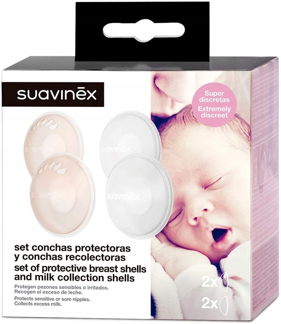 - Súprava ochranných krytov, ktoré zabraňujú treniu oblečenia o citlivé alebo poškodené prsia; obsahuje pár zberných mušlí na zachytávanie únikov mlieka