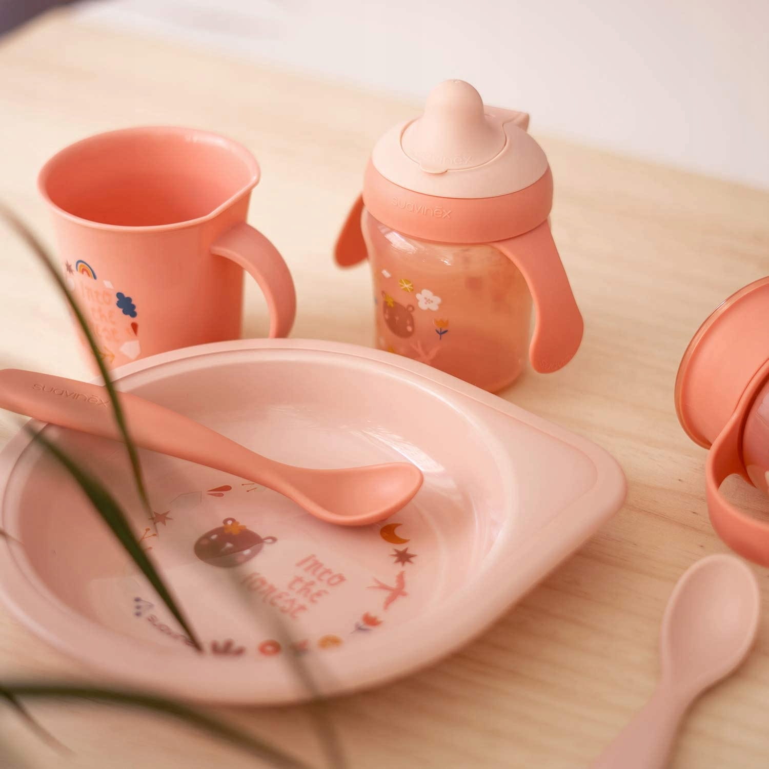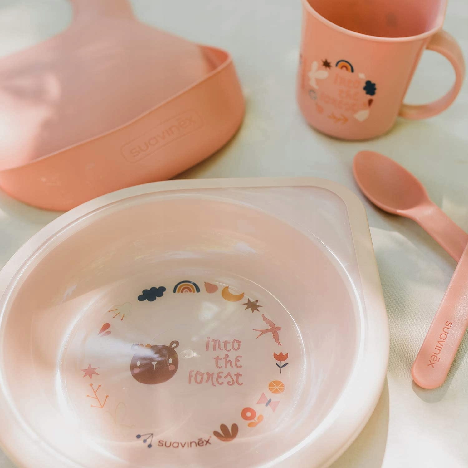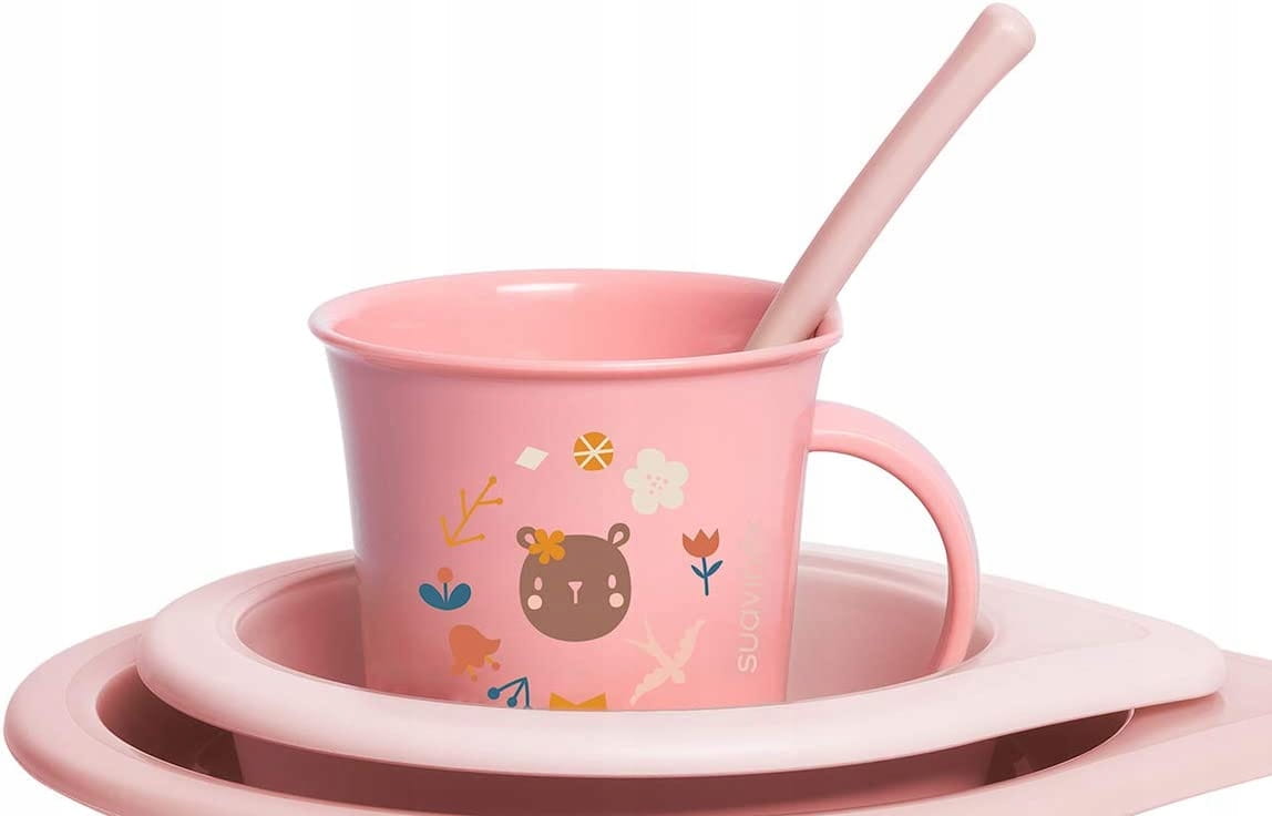 - Súprava jedálenského riadu pre bábätká od 6 mesiacov pozostávajúca z 3 častí: misky, pohárika a ľahkej lyžičky.