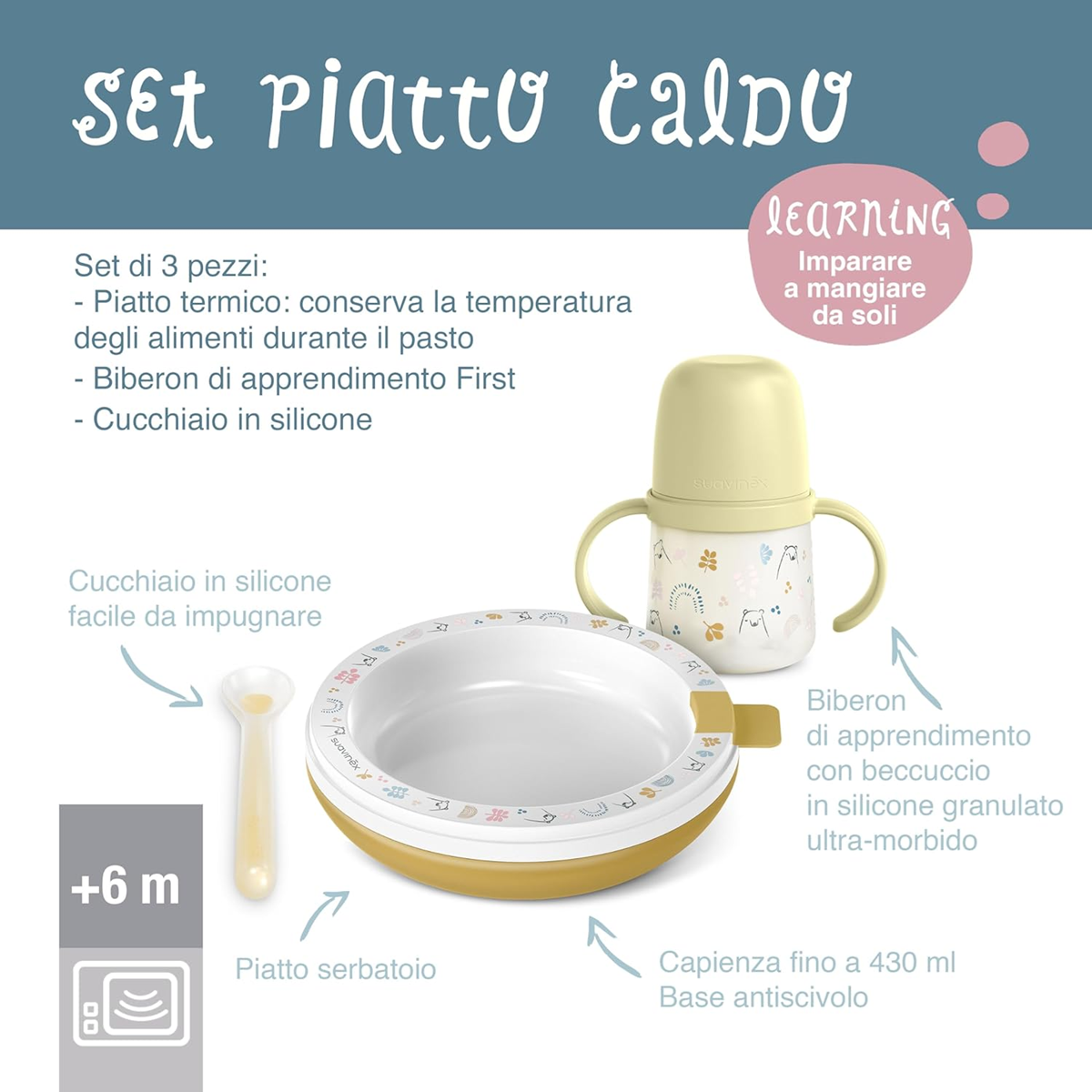 - Súprava je špeciálne navrhnutá na pomoc deťom v ranom období odstavenia a pri učení sa samostatne jesť a piť