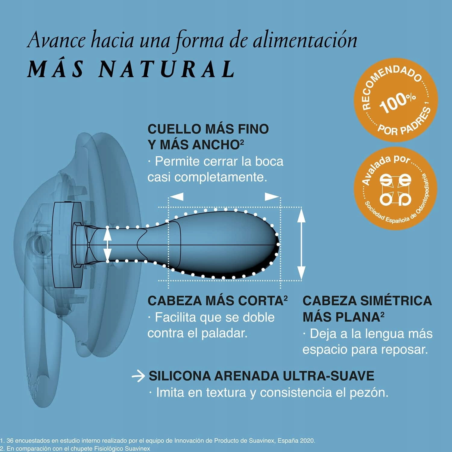 - Súprava 2 cumlíkov so silikónovým fyziologickým cumlíkom SX Pro pre dojčatá + 18 mesiacov. Starajú sa o správny vývoj dieťaťa. Fyziologický cumlík SX Pro je navrhnutý tak, aby nevstupoval do ústnej dutiny a poskytoval dieťaťu rovnaké pocity, aké zažíva v prirodzenom/fyziologickom stave, keď nepoužíva cumlík. Zvyčajne bez cumlíka. S fyziologickým piestom SX Pro. Tenký, širší krk, kratšia a plochá hlavička umožňuje takmer úplné zatvorenie úst. Symetrický, nezáleží na tom, z ktorej strany je cumlík umiestnený a nič sa nestane, keď ho dieťa otočí, vždy dobre sedí. Ultra tenký silikón, ultra tenký, pieskovaný povrch. Silikón napodobňuje textúru a tvar bradavky, poskytuje maximálne teplo a super pružný pohyb, ktorý prispôsobuje piest ústnej dutine. Otočný. Symetrický piest je vždy dobre osadený v náustku, nič sa nestane, keď dieťa otočí cumlík. SEOP SCHVÁLENÉ Piest Suavinex SX Pro je schválený Španielskou stomatologickou spoločnosťou (SEOP).