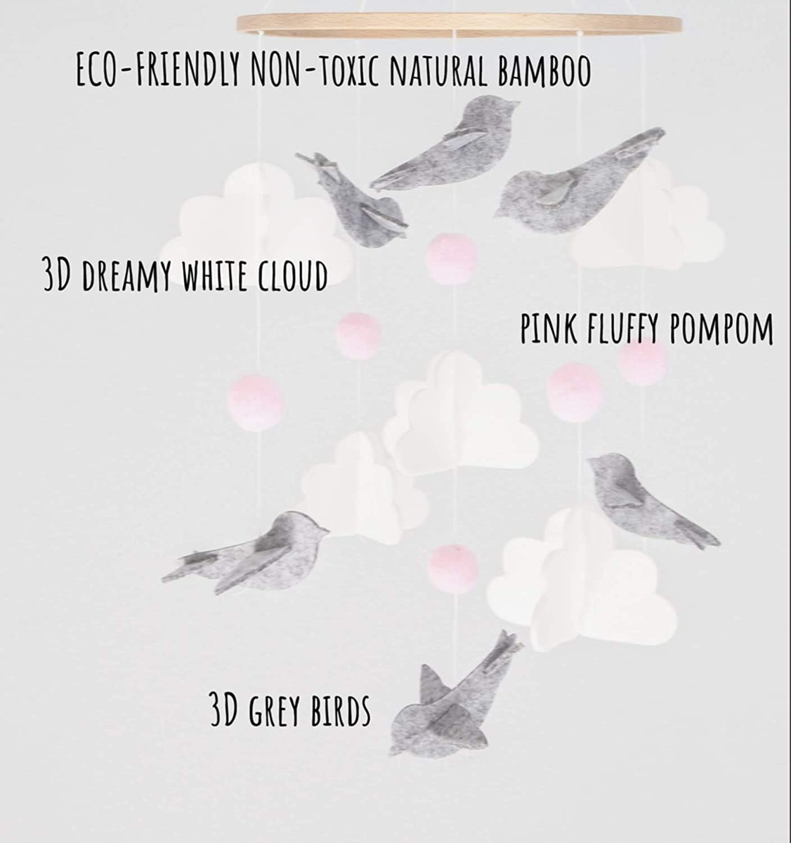 - Unikátny a minimalistický dizajn: plstené guličky sú vysokej kvality a nezamotávajú sa medzi sebou. Poskytujú bábätkám vizuálnu stimuláciu s hĺbkou. Prírodná, upokojujúca farba poskytuje dostatočný záujem pre novorodencov, ale neprebúdza ich. Zároveň jasné farby môžu vizuálne stimulovať dieťa a prebúdzať jeho zvedavosť, rozvíjať jeho schopnosť vnímať farby.