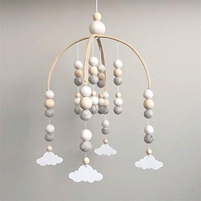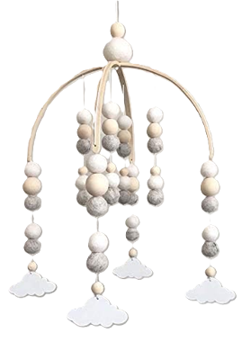 - Prírodné materiály: mobilný zvonček nad detskú postieľku je vyrobený z ekologického plstia a háčkovaných korálok, vysoko kvalitných drevených korálok, dreveného prívesku, netoxický, ekologický, bezpečný, možno ho používať bez obáv, vyrobený z neošetreného prírodného bambusu, je veľmi ľahký a možno ho zavesiť na postieľku alebo na iné miesta.