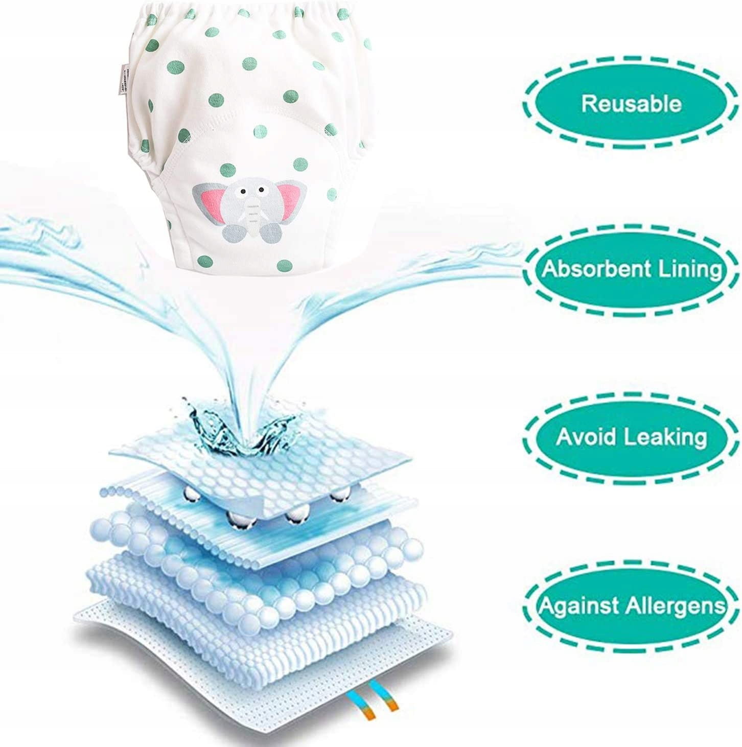 - Tréninkové nohavičky pre bábätká: 100% bavlna (vložka) + 15% vodotesná vrstva PU, možno prať v práčke alebo prať vo vode pri teplote 30 stupňov, mäkké a pohodlné. Tréningové nohavičky je možné opakovane použiť.