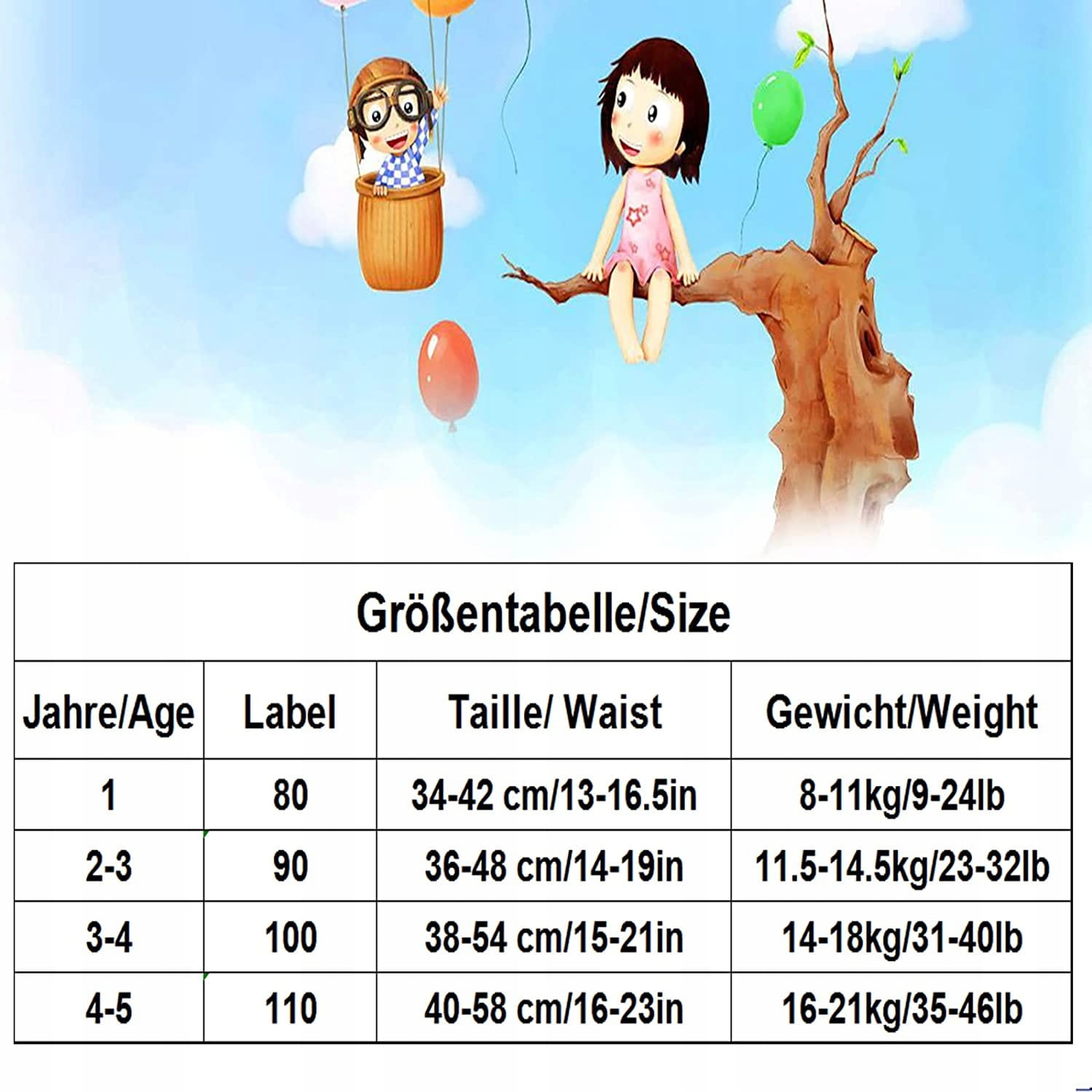 - Tréninkové nohavičky: 12 mesiacov (80), pás 34-46 cm, 2-3 roky/2T (90), pás 36-50 cm, 4 roky/4T (100), pás 38-54 cm, 5 rokov/5T (110) pás 40-58 cm