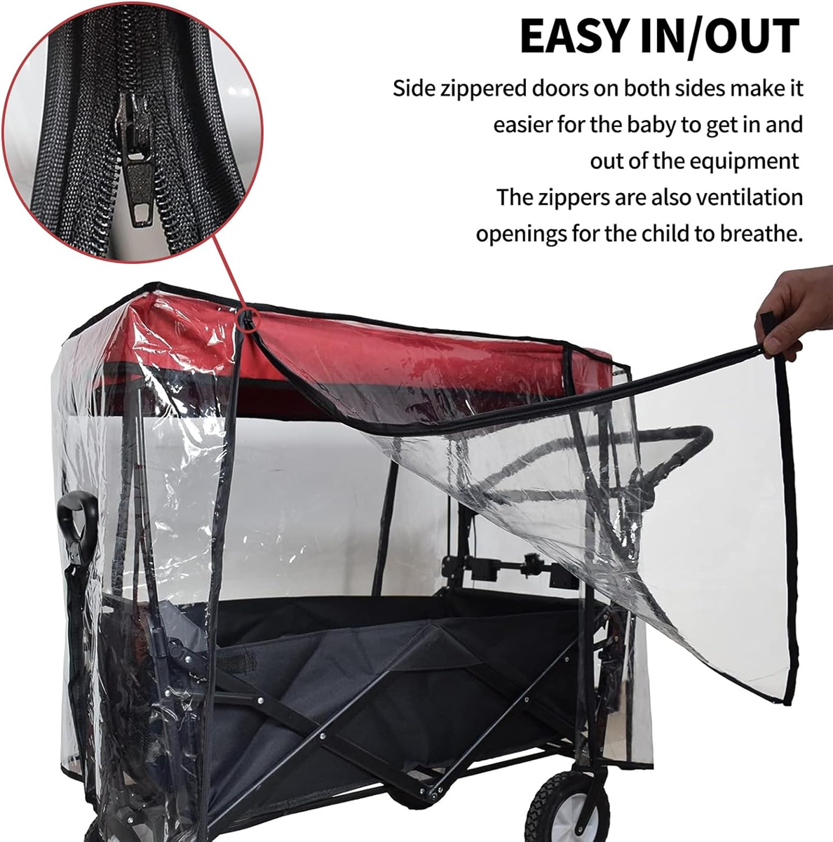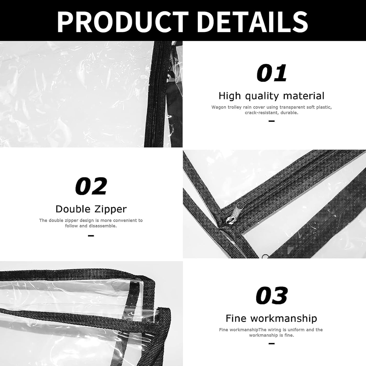 - Komplexná ochrana: pláštenka na detský kočík so zipsom zabraňuje dažďu, na oboch stranách krytu kočíka sú vetracie otvory pre lepšiu cirkuláciu vzduchu, s veľkými priehľadnými oknami, ideálna pre bábätká na nastupovanie a vystupovanie, poskytuje dokonalý výhľad. Príslušenstvo ku krytu kočíka poskytuje úplnú ochranu pred dažďom, vetrom, snehom a chladom.