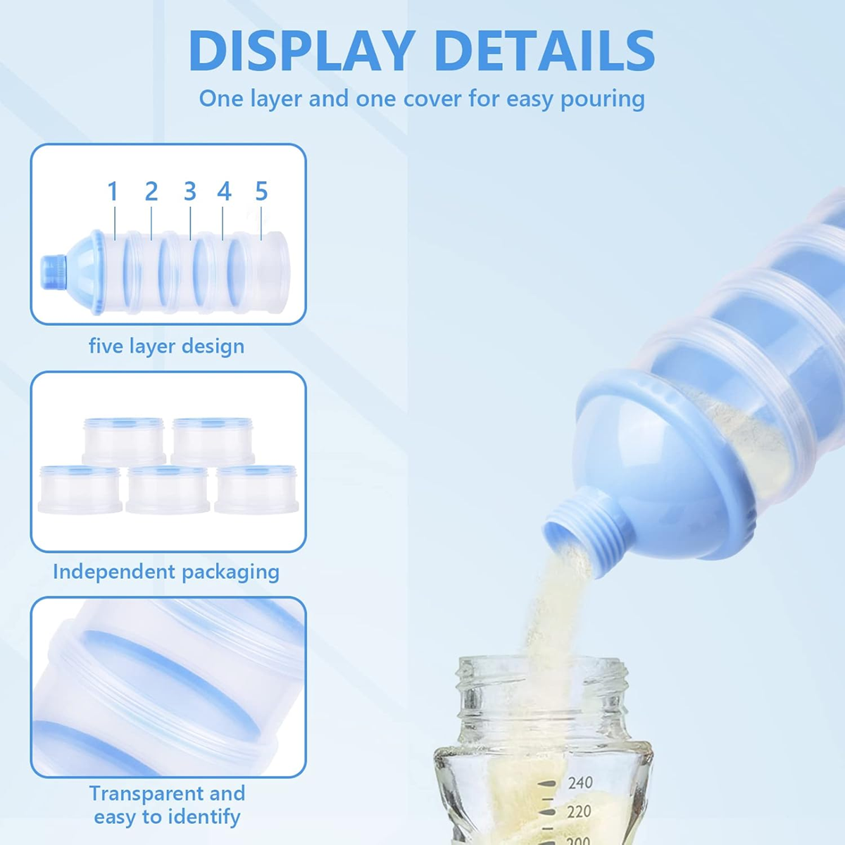 - 5 vrstiev priehradiek: dávkovač práškového mlieka pre deti má 5 vrstiev priehradiek, kapacita jednej vrstvy je 100 ml, priehľadná konštrukcia a každá vrstva má samostatné viečko, čo umožňuje pohodlný prístup k viacerým položkám naraz. Vďaka viečku s lievikom je ľahké nasypať práškové mlieko.