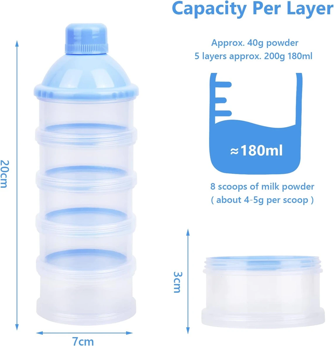 - 5 vrstiev priehradiek: dávkovač práškového mlieka pre bábätká má 5 vrstiev priehradiek, kapacita jednej vrstvy je 100 ml, priehľadná konštrukcia a každá vrstva má samostatné viečko, čo umožňuje pohodlný prístup k viacerým položkám naraz. Vďaka viečku s lievikom je ľahké nasypať práškové mlieko.