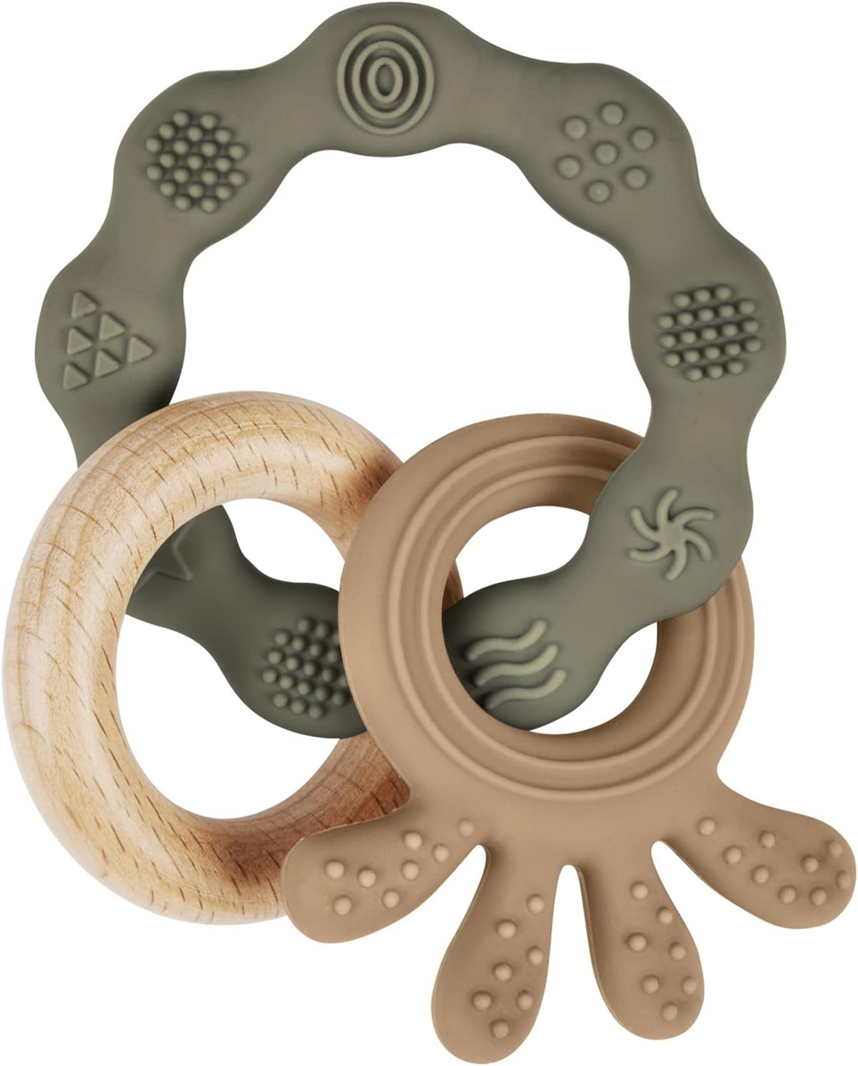 Prírodná úľava pri prerezávaní zúbkov a rozvoj zmyslov v jednom produkte. Textúrované hryzátko kombinuje mäkký silikón potravinárskej kvality s prírodným bukovým drevom, poskytuje upokojujúcu masáž ďasien a bezpečnú zábavu na precvičovanie úchopu a koordinácie.