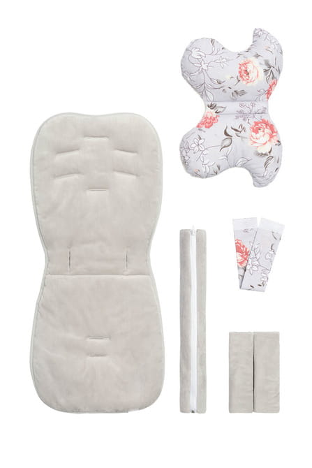 Deluxe set sa skladá z obojstrannej vložky do kočíka, vankúša motýlik a návlekov na madlo a pásy. Vložka aj vankúš sú z jednej strany potiahnuté 100% bavlnou a z druhej strany majú príjemný materiál na dotyk. Vložka je mäkká, ale zároveň neznižuje pohodlie sedenia. Určená pre športové aj hlboké kočíky, má otvory na pásy, vďaka čomu pasuje do každého kočíka. Okrem praktickej funkcie ochrany pred znečistením a zvýšenia komfortu cestovania, set oživí interiér kočíka a dodá mu výrazný charakter.