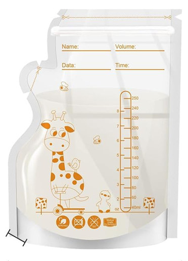- Veľká kapacita - kapacita vrecka je 250 ml. Priamo na vrecku je miesto, kde môžete zapísať názov a dátum materského mlieka, aby ste ho ľahšie identifikovali a skladovali (tip: pre presnú mierku pred zabalením vytlačte zvyšný vzduch z vrecka na materské mlieko. "Úspora objemu").