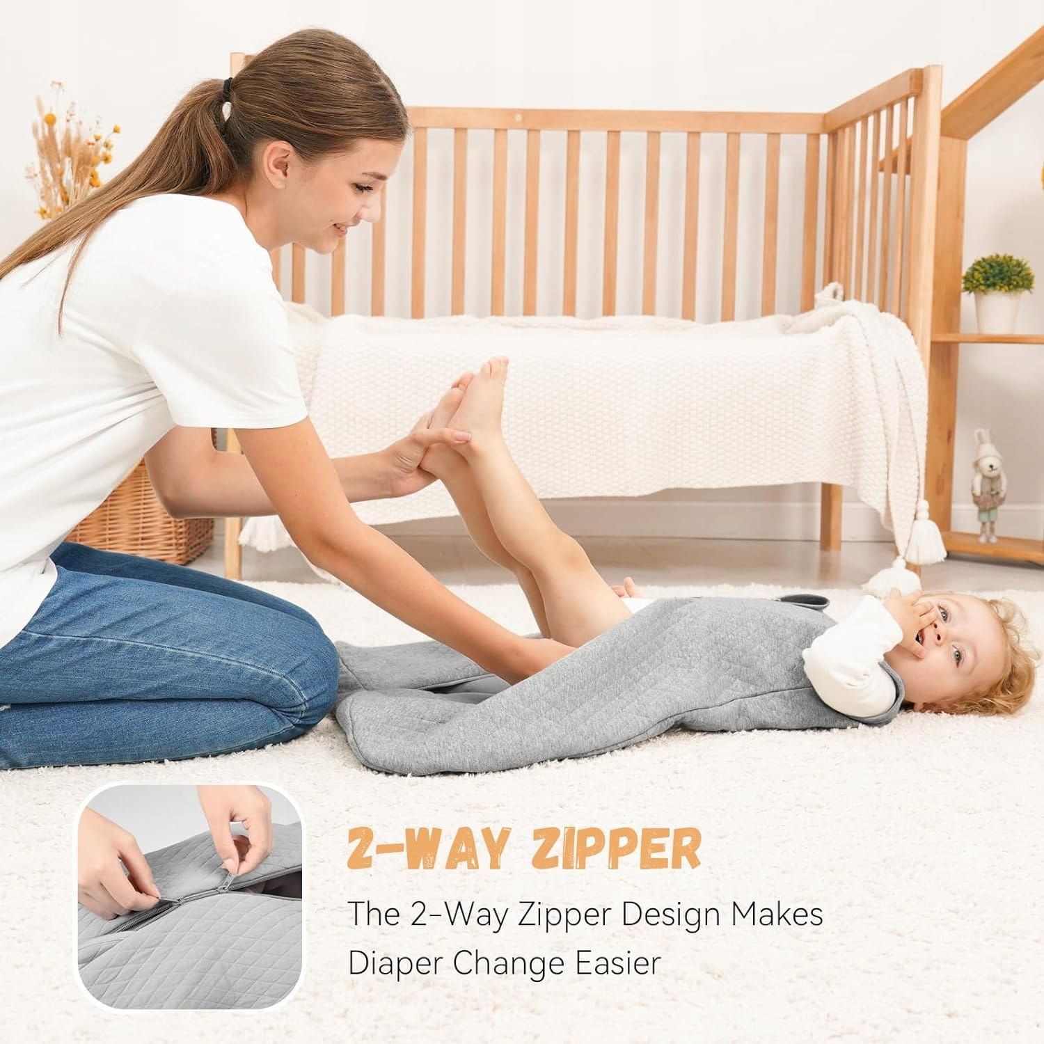 - 【Ochrana zipsu】 Uľahčite nočné prebaľovanie vďaka praktickému obojsmernému zipsu na našom detskom nosiacom prikrývke. Navrhnutý s ohľadom na pohodlie, umožňuje matkám rýchlu a jednoduchú výmenu plienky bez narušenia spánku dieťaťa. Užite si bezproblémové a pohodlné prebaľovanie dieťaťa.