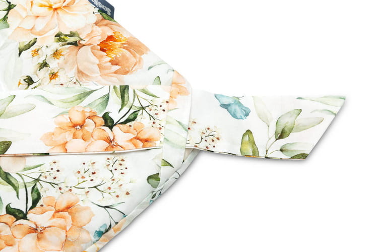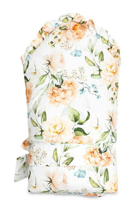Obojstranný zavinovačka pre bábätká s volánikom bola vytvorená s ohľadom na novorodencov a dojčatá. Viazacie zapínanie so širokou bavlnenou stuhou umožňuje pohodlné držanie dieťaťa počas kŕmenia a uspávania. Po rozložení môže byť zavinovačka úspešne použitá ako prikrývka do postieľky alebo detského kočíka. Môže tiež slúžiť ako hracia podložka. Vyrobená je zo 100% bavlny. Výplň zavinovačky tvorí nadýchané silikónové vlákno. Dokončenie tvorí vkusný volánik.