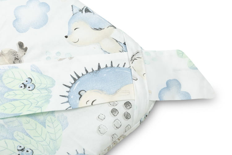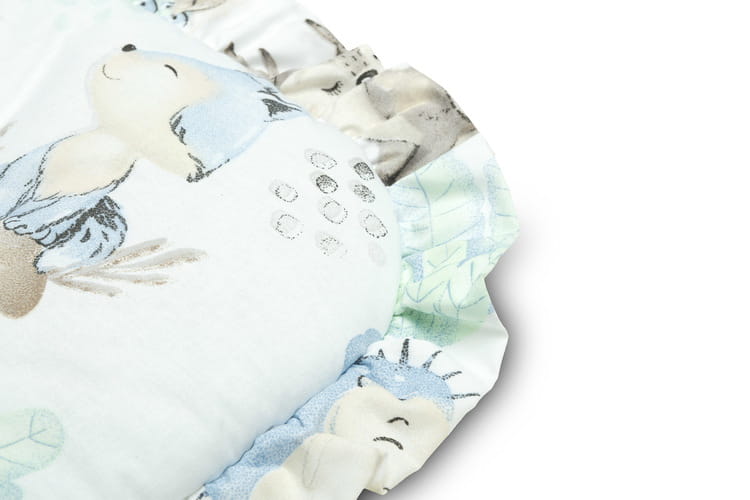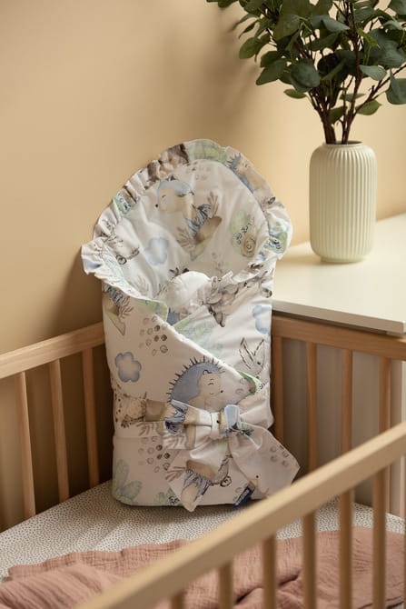 Obojstranný zavinovačka pre bábätká s volánikom bola vytvorená s ohľadom na novorodencov a dojčatá. Viazané zapínanie so širokou bavlnenou stuhou umožňuje pohodlné držanie dieťaťa počas kŕmenia a uspávania. Po rozložení môže byť zavinovačka úspešne použitá ako prikrývka do postieľky alebo detského kočíka. Môže tiež slúžiť ako hracia podložka. Vyrobená je zo 100% bavlny. Výplň zavinovačky tvorí nadýchané silikónové vlákno. Dokončenie tvorí vkusný volánik.